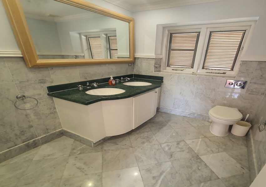 Downstairs, left from entrance hall is a twin bedroom with A/C, fitted wardrobes, built in safe and door to the front garden. The ensuite shower room has a w.b., w.c. and shower.