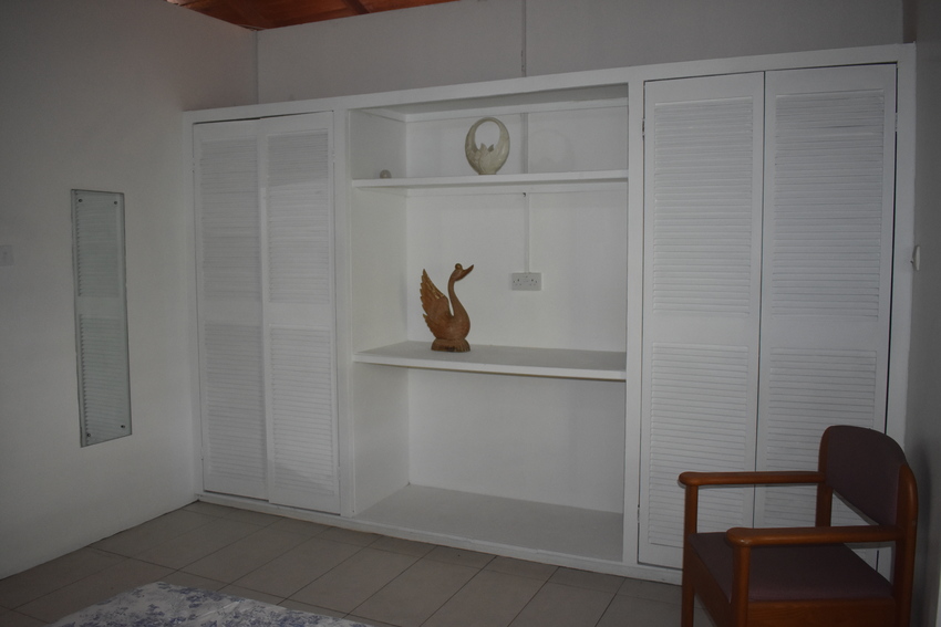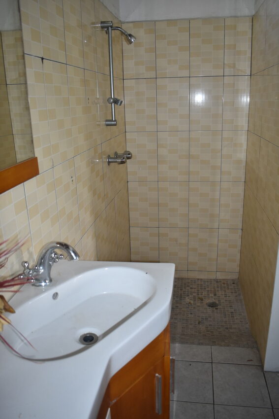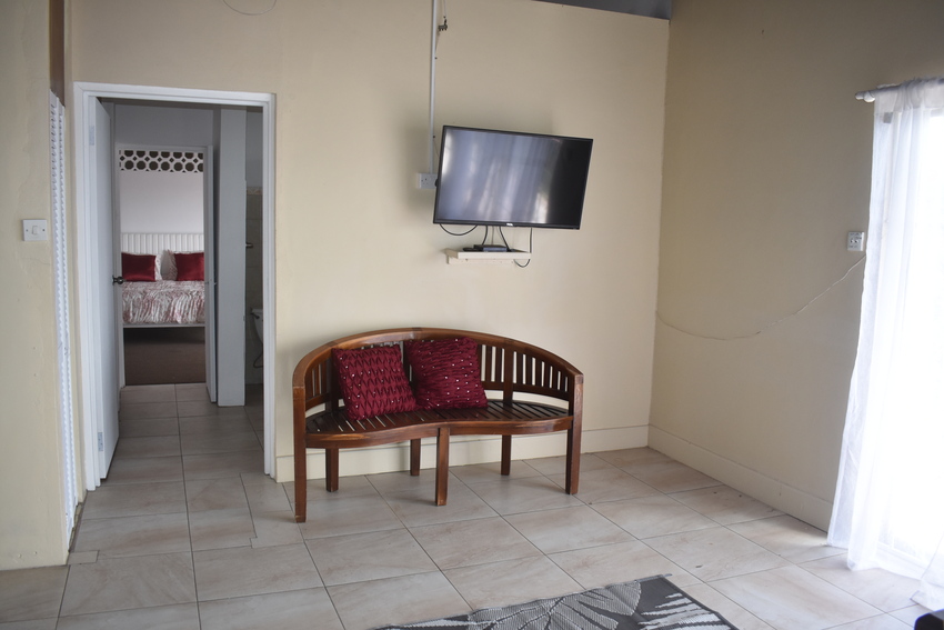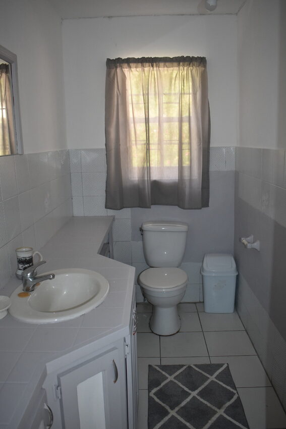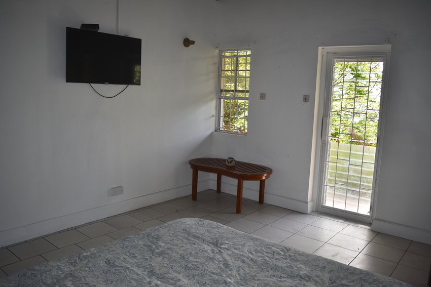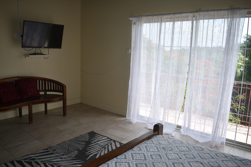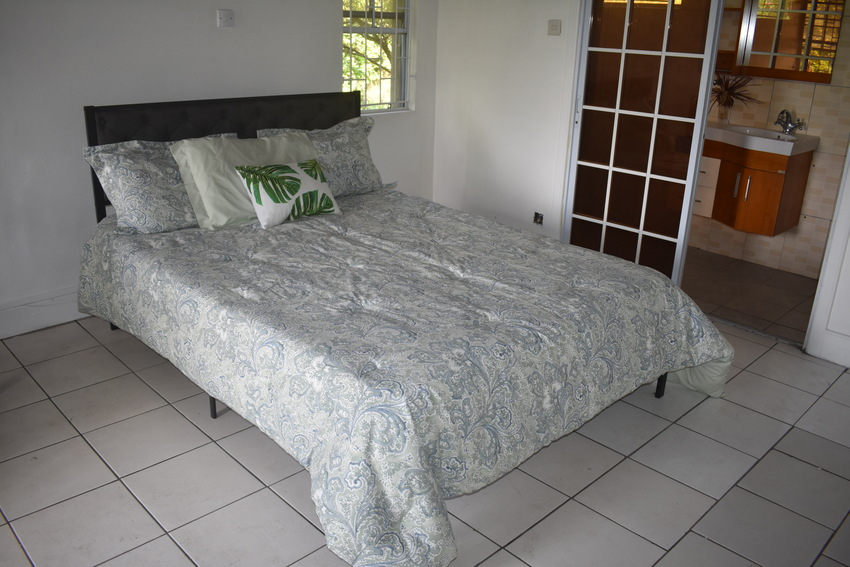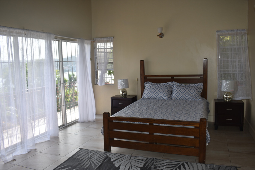 The home itself though rustic is spacious and airy, designed for open plan living. The hardwood flooring, with glass sliding-doors lead directly onto the patio which is decked with outdoor furniture perfect for Alfresco dining where one can relax with the lovely sea view of the Castries Harbour and distant mountainous landscape. The well-appointed kitchen connects seamlessly with the dining room and features a granite countertop double vanity stainless steel sink, top to bottom cabinetry, pantry for ample storage, stainless oven, and a 5-burner gas cooktop. To the corner of the living area is a powder room.