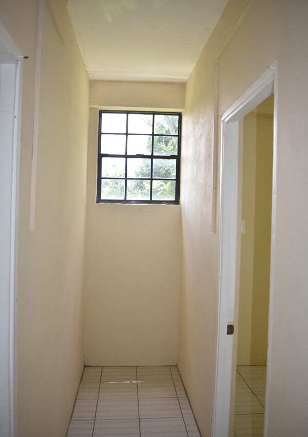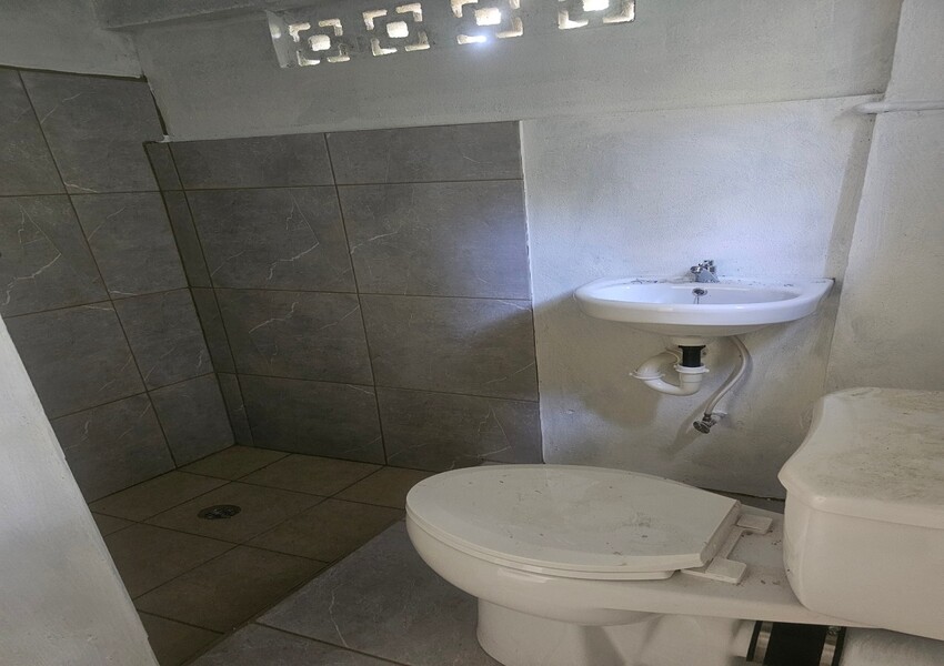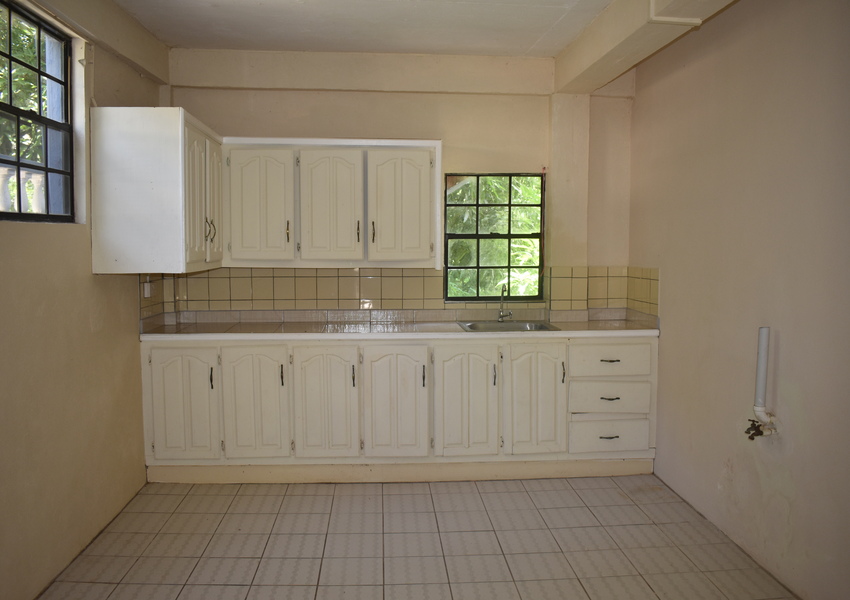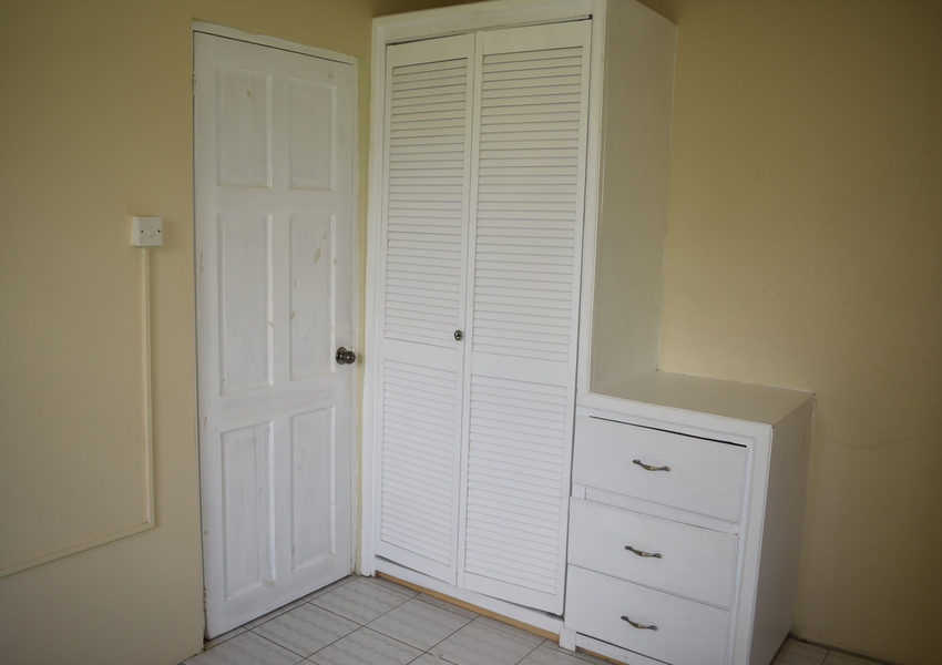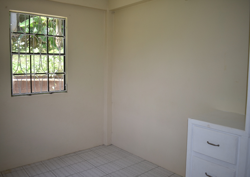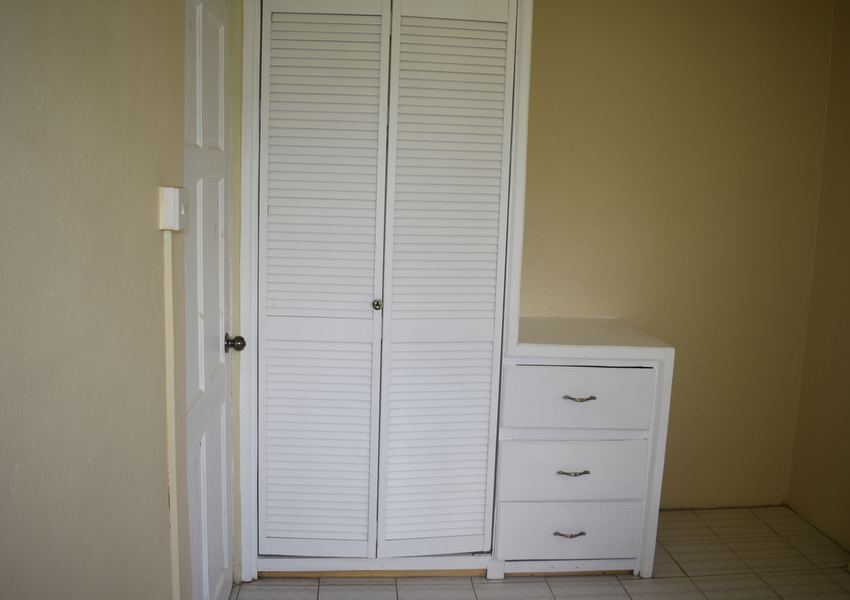 Upon entrance into this unit, one is greeted with an open plan living room, dining area and kitchen. The kitchen contains a double sink with top to bottom white stained wooden cabinetry. The countertop is made of white porcelain tiles complimented by a marble tiled backdropped. There is allotted space for a stove and refrigerator. The living room/entertainment has two big windows which fill the space with natural light and the ease of air flow throughout the space.