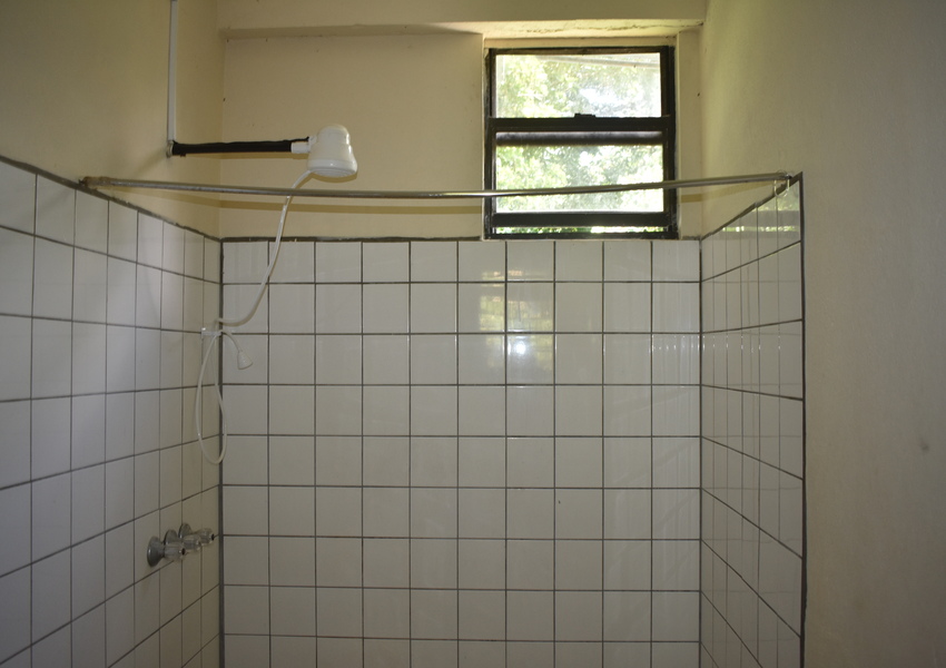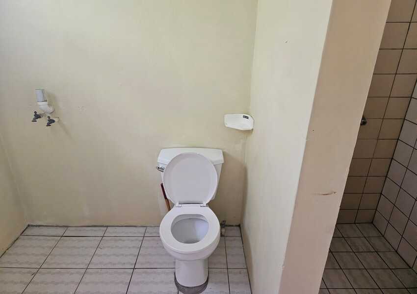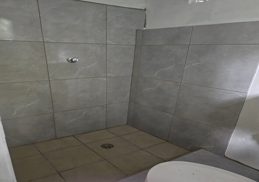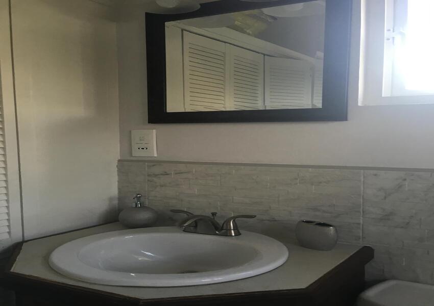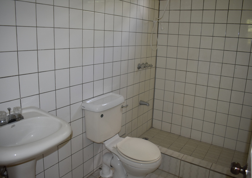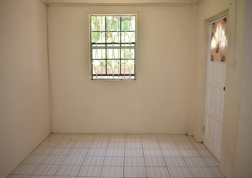 Upon entrance into this unit, one is greeted with an open plan living room, dining area and kitchen. The kitchen contains a double sink with top to bottom white stained wooden cabinetry. The countertop is made of white porcelain tiles complimented by a marble tiled backdropped. There is allotted space for a stove and refrigerator. The living room/entertainment has two big windows which fill the space with natural light and the ease of air flow throughout the space.