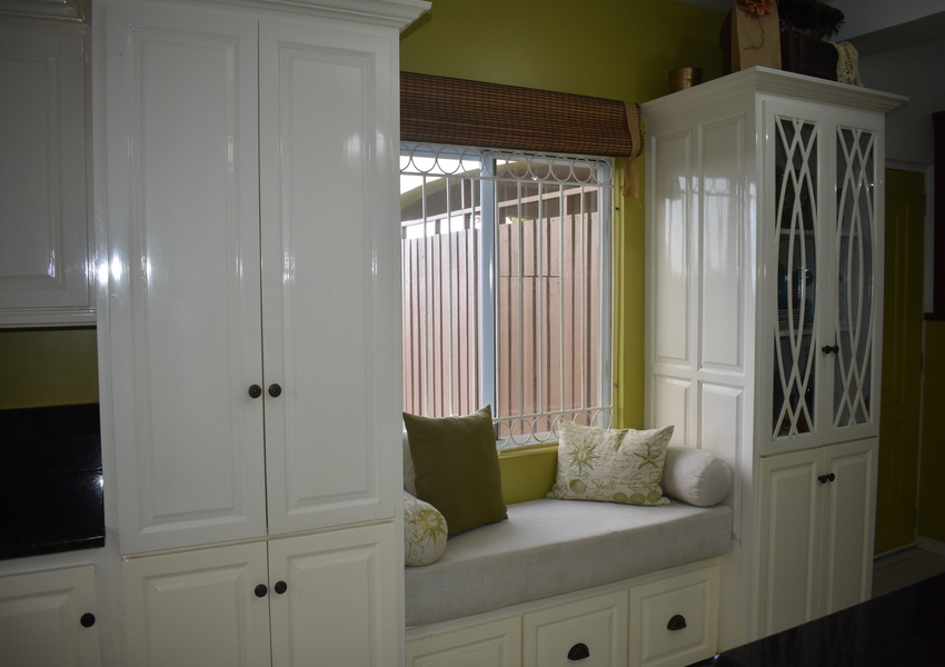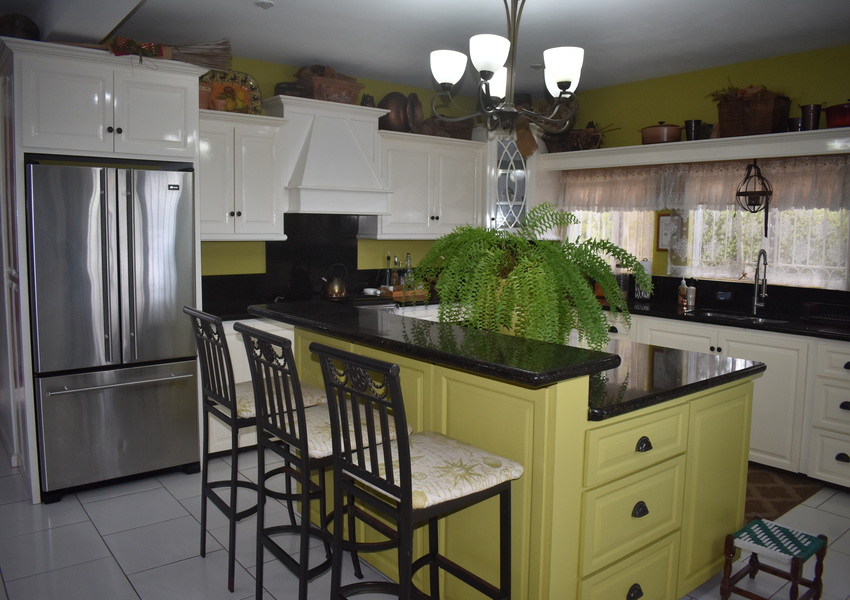 The heart of the home is a unique kitchen, where white-stained cabinetry contrasts beautifully with bold mustard accents and sleek black granite countertops. A large island creates an inviting hub for casual meals, while a bayside window invites quiet moments bathed in sunlight on a comfortable, cozy loveseat.