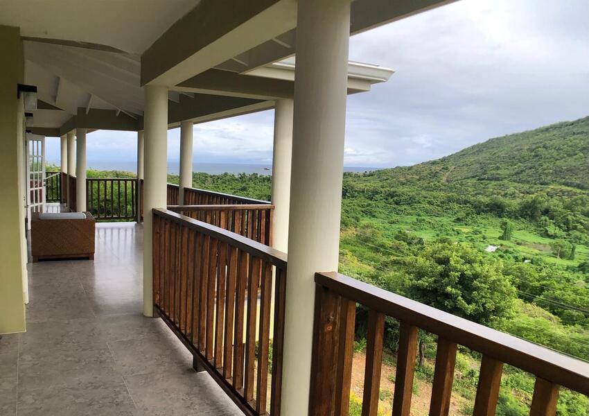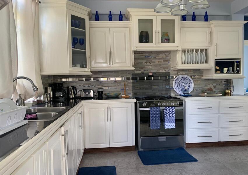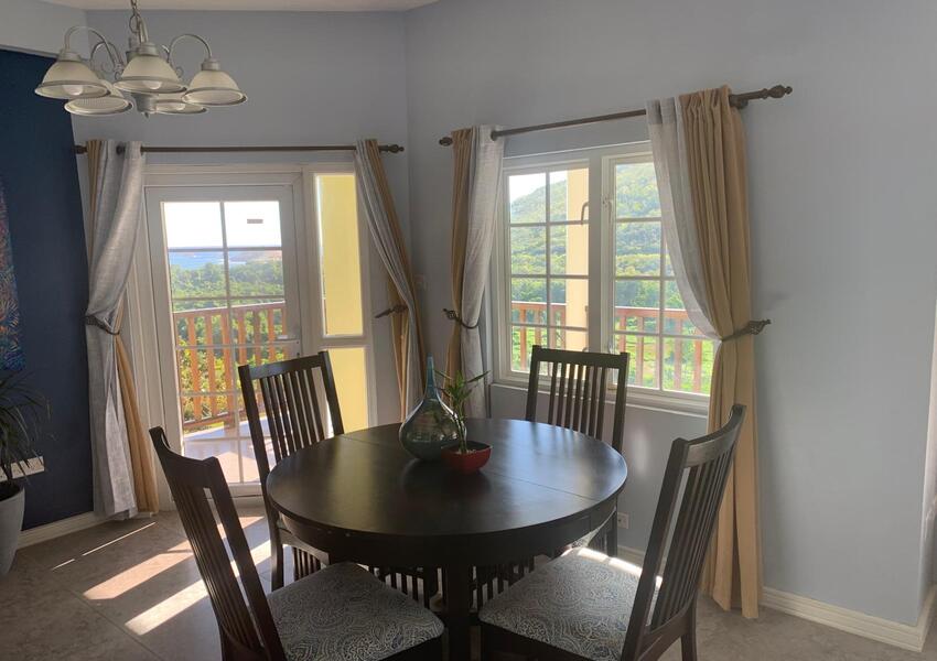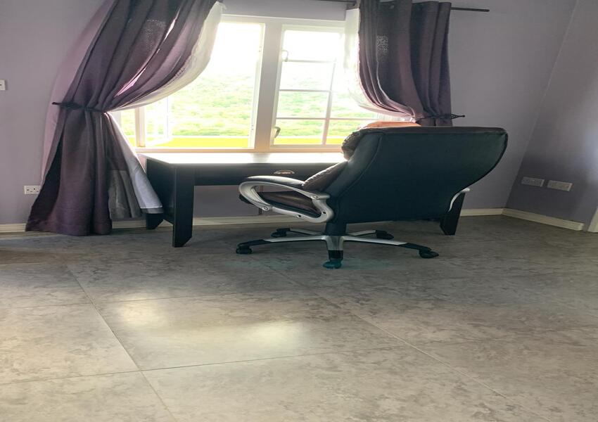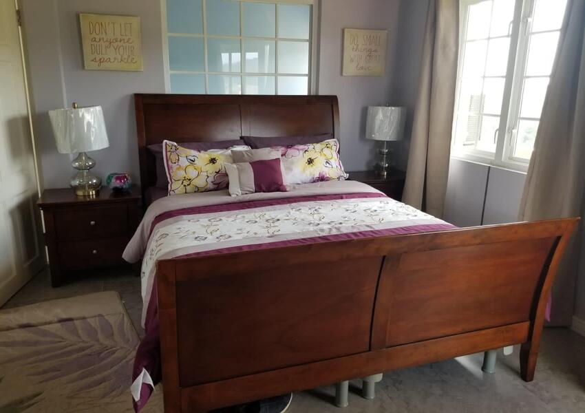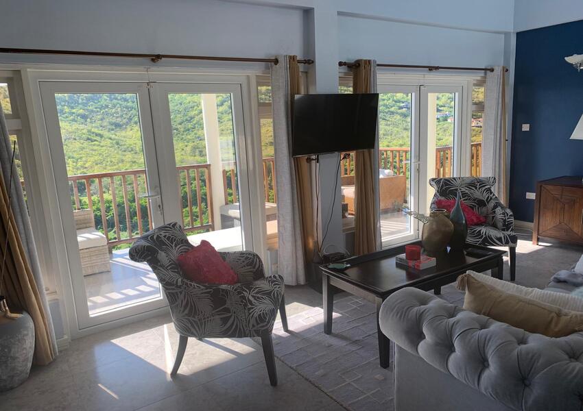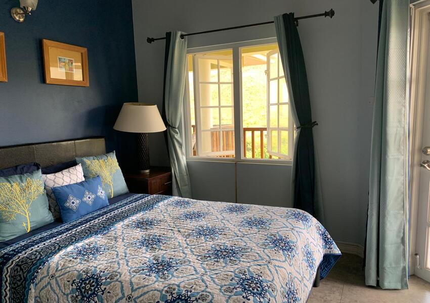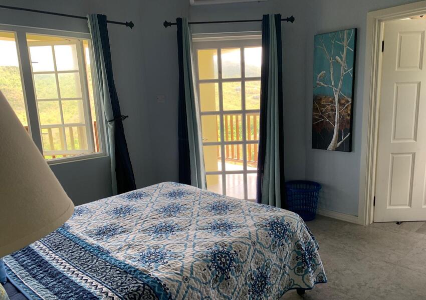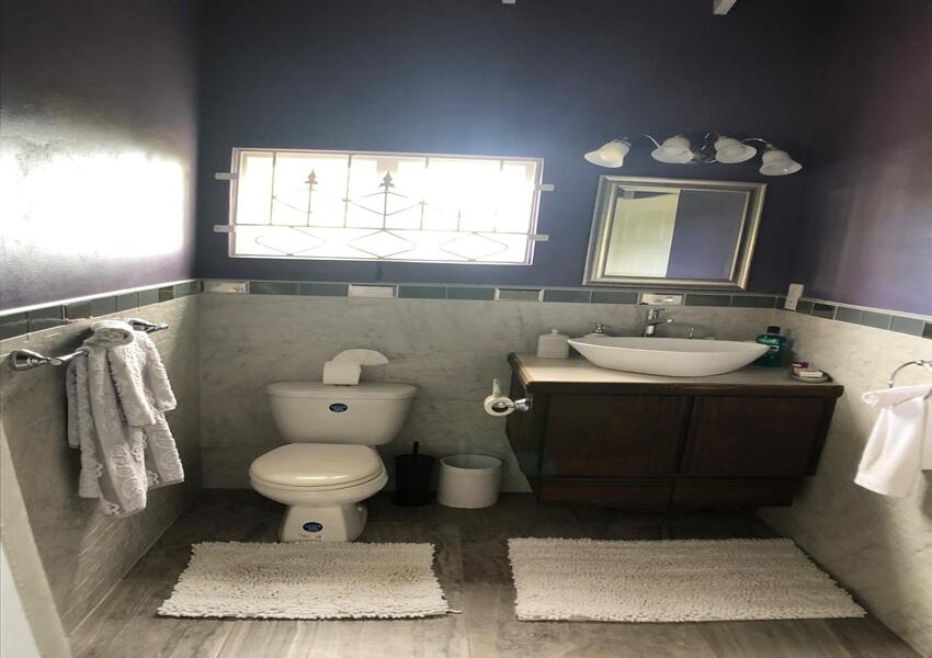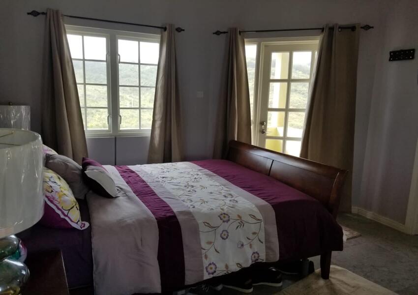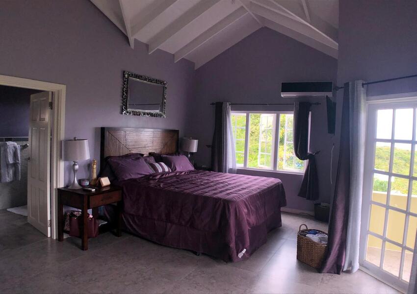 The home features three generously sized bedrooms, each with its own en-suite bathroom and air-conditioning unit, ensuring privacy and comfort for all occupants. The master suite is nothing short of sensational: its bold purple walls and white-stained vaulted ceilings create a striking yet serene ambiance, while the queen-sized bed anchors the room with a sense of luxury. A private balcony extends from the master, offering breathtaking views of the lush mountains and the sparkling sea beyond—a perfect setting for morning coffee or evening reflection. The master suite also includes a small office nook, ideal for those who work from home or need a quiet corner for study.
