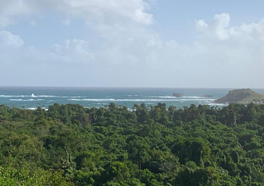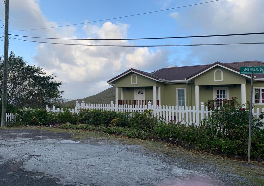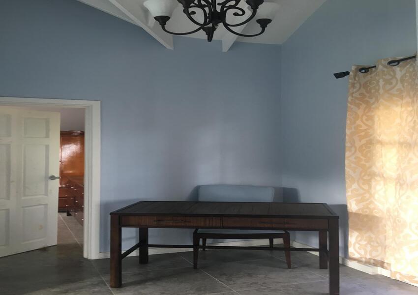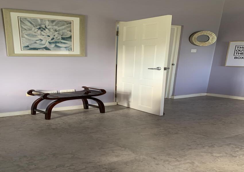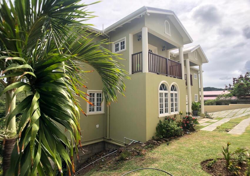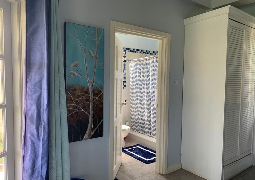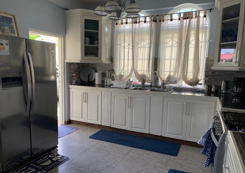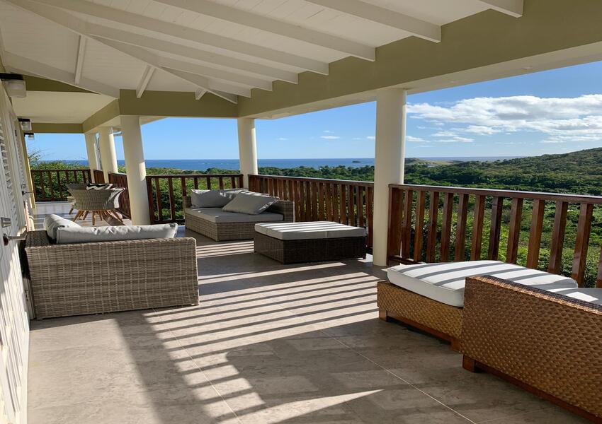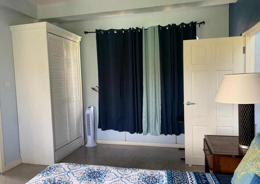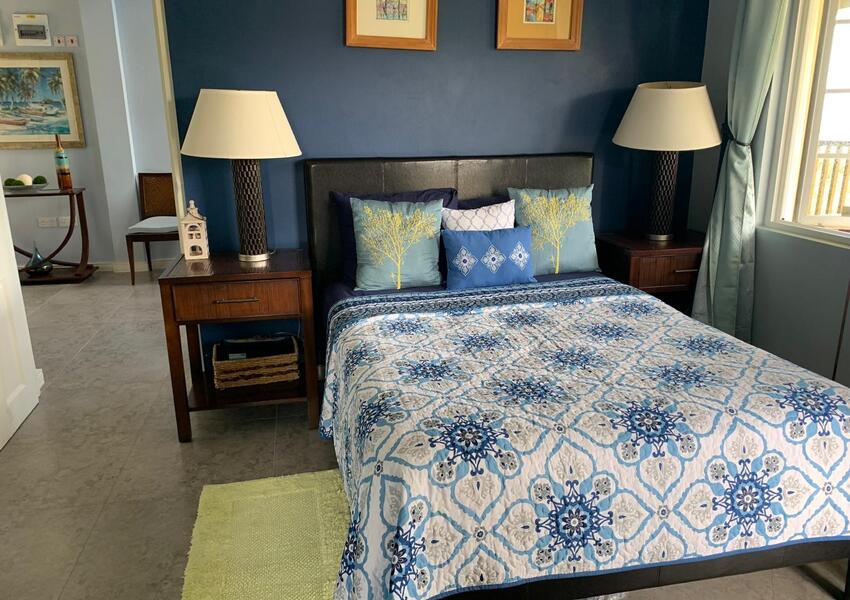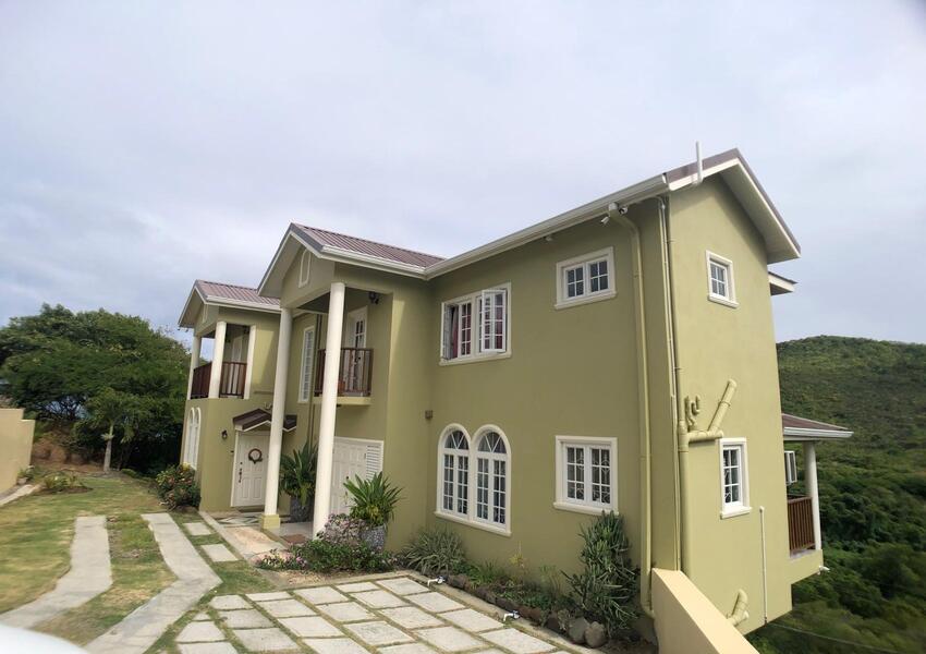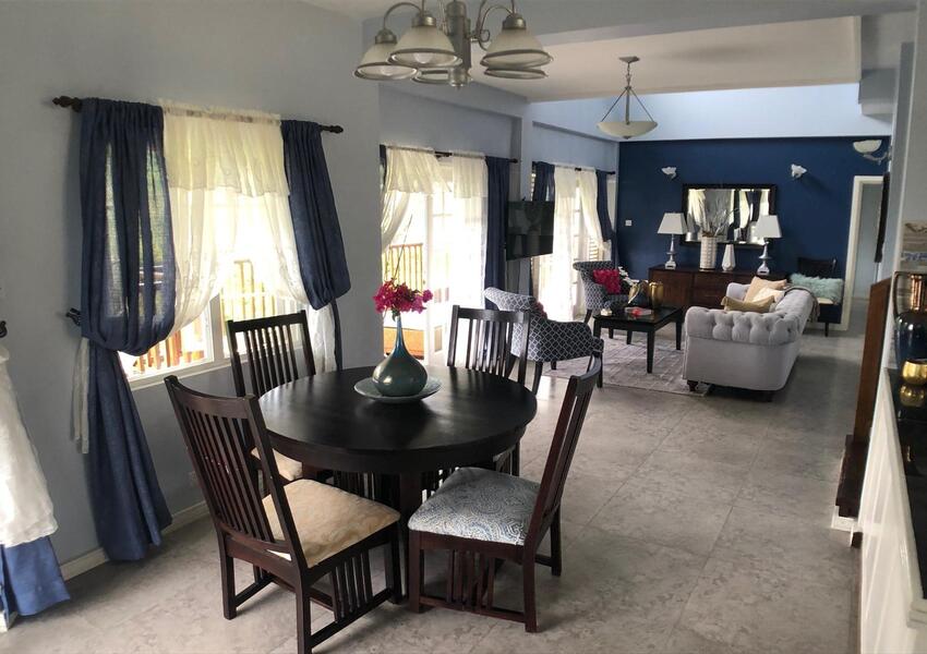 The home features three generously sized bedrooms, each with its own en-suite bathroom and air-conditioning unit, ensuring privacy and comfort for all occupants. The master suite is nothing short of sensational: its bold purple walls and white-stained vaulted ceilings create a striking yet serene ambiance, while the queen-sized bed anchors the room with a sense of luxury. A private balcony extends from the master, offering breathtaking views of the lush mountains and the sparkling sea beyond—a perfect setting for morning coffee or evening reflection. The master suite also includes a small office nook, ideal for those who work from home or need a quiet corner for study.
