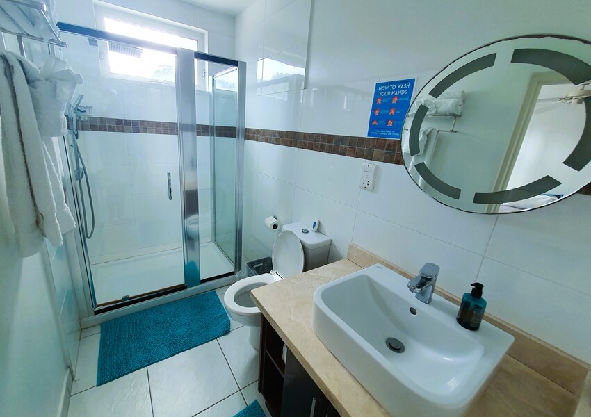 At first floor level are two double bedrooms, with hardwood floors (Brazilian Cherry) throughout. Both have fitted cupboards, overhead fans, A/C and ensuite bathrooms with shower, bidet, w.c. and w.b. The bedroom at the front of the property has double doors leading on to a large balcony with lovely views of the Caribbean Sea.